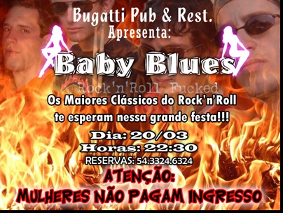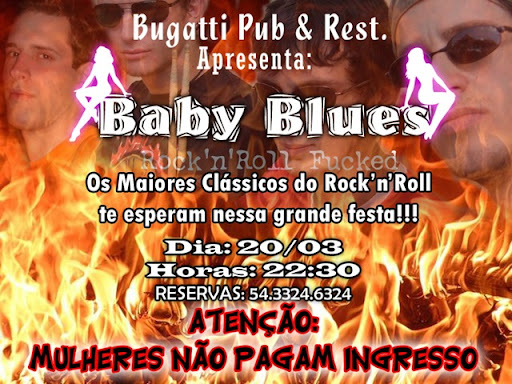 Atenção mulheres!!! Isso mesmo vocês não pagam entrada para o grande show de Quinta-Feira (20/03) no Bugatti Pub & Rest. Yeah, será uma grande noite, com muita música de qualidade. Os clássicos dos mais variados lados do Rock'n'roll te esperam nessa grande noite. Esperamos Vocês lá.