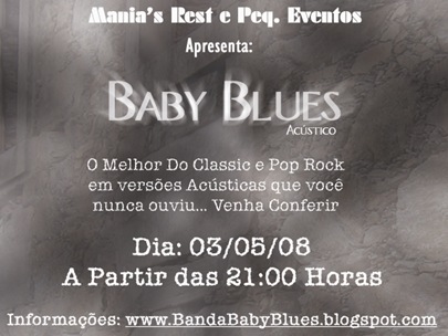 Isso aí pessoal, show confirmado para amanhã, sábado dia 03/05. Vamos fazer um repertório muito legal, eu em particular, estou empolgado com as versões modificadas que vão sair, mas tudo dentro do Estilo Baby Blues. Espero Todos Vocês lá, para apreciar sem moderação a Baby Blues. Yeahhh!!!!